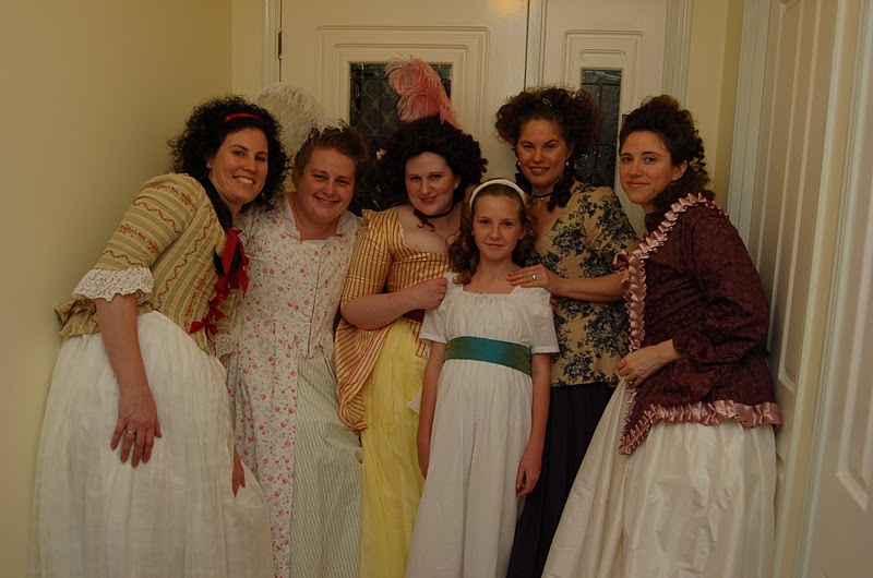 It was a fabulous evening. Everyone dressed up for the occasion which was really lovely to see. I didn't take many shots on my camera as I was so busy in the kitchen getting everything ready, but the camera was passed around a few times for other to take photos for me. As for my sewing of costumes, I put together an outfit for my brother - a white linen shirt, a blue / white brocade vest and blue knee breeches. I learnt him the grey cravat that I had made for our father some time ago. I was very pleased with how his ensemble came together as it is always a challenge for me dressing him (he is actually larger than the largest size on all the mens patterns). I also put together a new outfit for myself as well. I used the yellow and pink stripe silk that I bought last year in Adelaide at Eastern Silk to make an open robe and I polonaised it up at the back with a couple of fabric covered buttons. I somehow managed to scrimp the entire ensemble out of 3 metres of the fabric. The sleeves are a little tight, but that should be fixed by the next time I wear it (as long as I get back into exercise mode). The only other change that I would like to make is to add some eyelets down the front so that I can lace the gown up instead of pinning it. I also used a multitude of the yellow muslin that I had bought for a regency dress to make a full skirt for underneath. Add my wig, some flowers and a few feathers and I was all done for the evening. I was just extremely pleased to get my costume done in time.